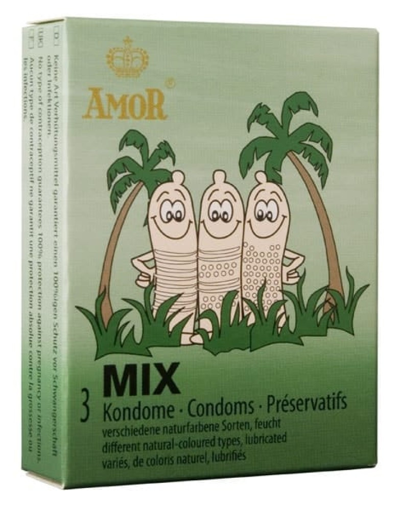 Made of natural latex, natural colored, lubricated condoms with a container. The package contains three textures: dotted (52 mm), ribbed (52 mm) and ribbed dotted, shaped (54 mm). Secure and provides a varied experience during intimate intercourse.