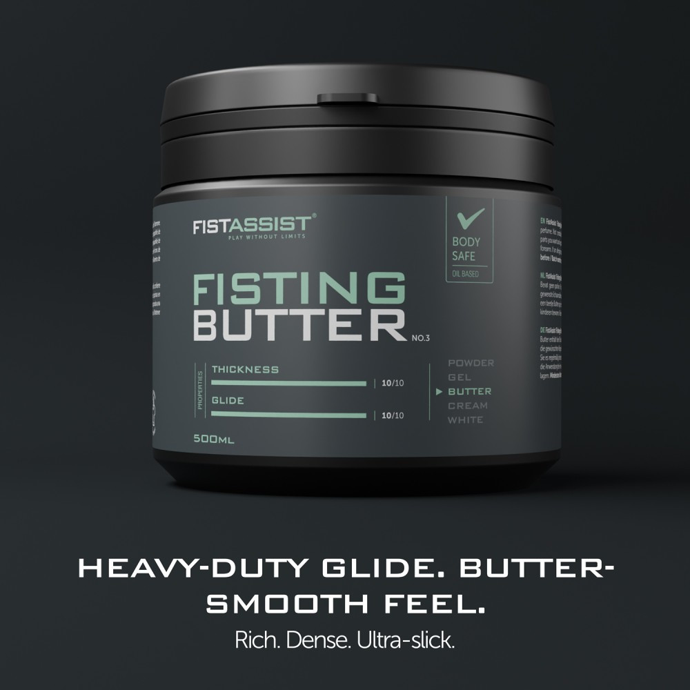 Fistassist Fisting Butter moisturizes and smoothes the skin to enhance the sensual experience. It does not contain perfume. It cannot be used with a latex condom. Directions for use: apply as much of the product as you want to the desired parts of the body and repeat as many times as you like. Before using the product regularly, apply a small amount to your forearms. If an allergic reaction occurs, discontinue use. Keep out of reach of children. Store in a cool, dark place.