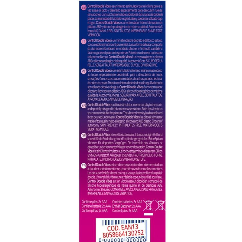 Két rezgő végtagjával duplán élvezheted az örömöt. A vibrátor intenzitása állítható, és víz alatt is használható. A Control Double Vibes egy intim stimulátor, amely ABS műanyagból és a legmagasabb minőségű hipoallergén szilikonból készült.