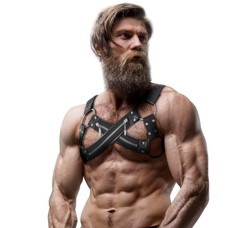 FETIS ALÁVETETTSÉG – ÁLLÍTHATÓ NEOPRÉN KERESZTBE HELYEZETT MELLKASOS BULLDOG HÁM CIPZÁRRAL FÉRFIAKNAK