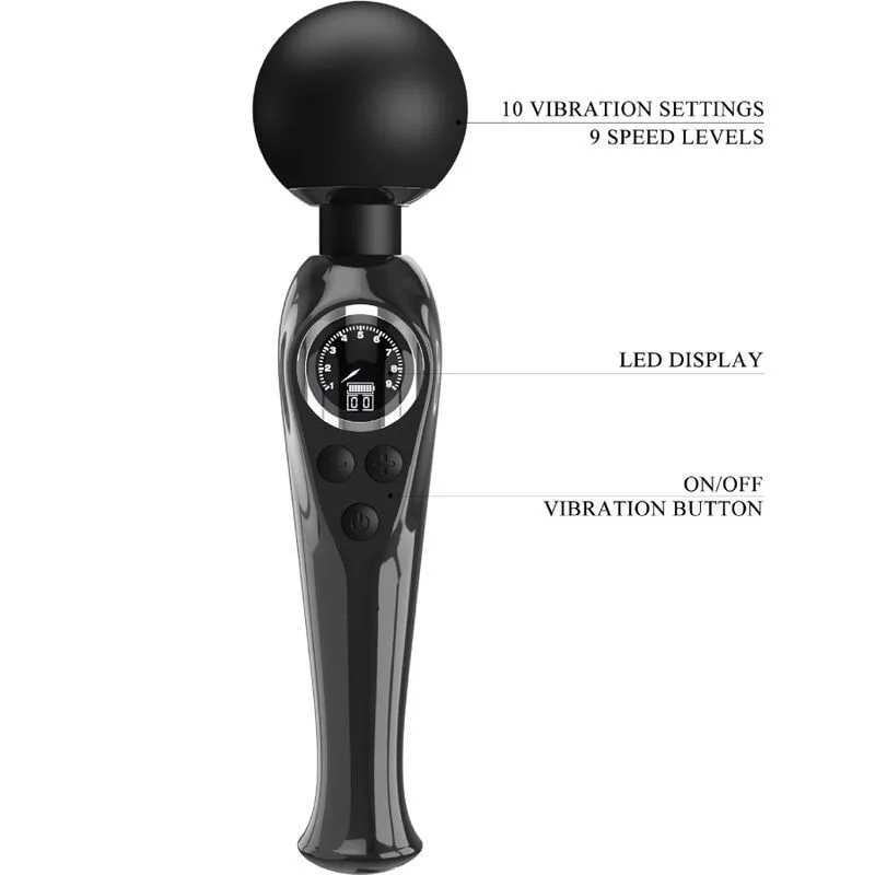 Ez a kifinomult rezgő pálca rendkívül erős motorral rendelkezik a széles fejében, amelynek rugalmas nyakával segít, hogy 10 rezgési módot és 9 sebességet válassz ki bárhol, ahol a leginkább szeretnéd. A göygerdő test kompakt a kényelmes tapadásért és elég könnyű. Könnyen használható digitális LCD kijelzője van, amely megmutatja a beállításokat és az akkumulátor szintét. Tökéletes kiegészítője azoknak a pároknak a hálószobájának, akik intenzív, érzéki és teljes vibráló érintkezést élveznek.
