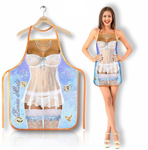 Lendületes báj és érzékiség a nagy nap előtti pillanatokhoz! Ez a csábító, fehérneművel díszített menyasszonyi kötény játékos eleganciával varázsol mosolyt és szerencsét minden lánybúcsúra – tökéletes ajándék a jegyespárnak!