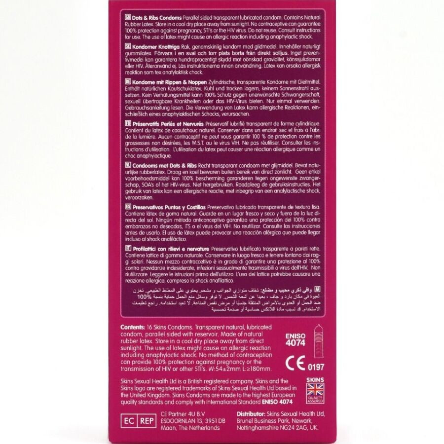 Remember! When used correctly, Skins Dots & Ribs significantly reduce the risk of pregnancy and sexually transmitted infections. Immerse yourself in a sea of pleasure and never leave home without a Skin!