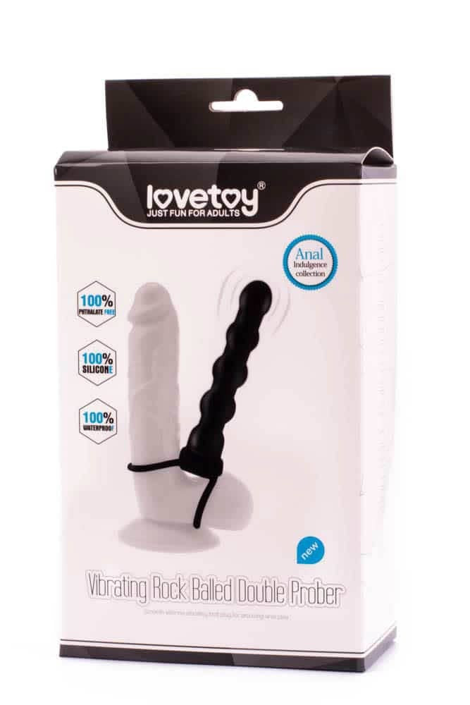 Für Paare gemacht, penisförmiger, einschrittiger Anal mit Vibrator, der auf oder am eigenen Penis befestigt werden kann. Der auf dem Bild gezeigte Hoden ist nicht Teil der Verpackung.
