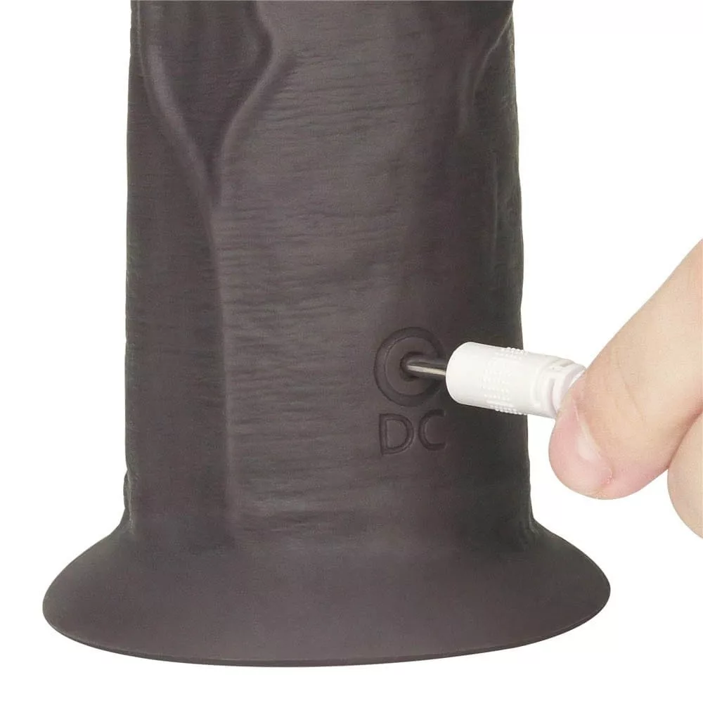 A with a soft outer layer and a hard inner core, made of a leather-like material similar to body tissue, with 10 vibration and 10 rotation functions, with a veined surface and a 360° rotating tip. Vibrations and rotations can also be controlled via a wireless remote control. It can be attached to a flat surface with the help of its suction cup.