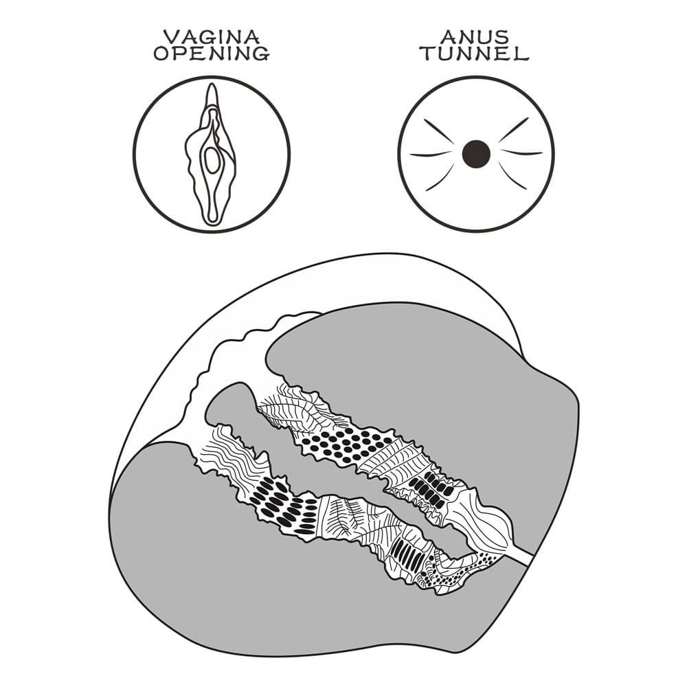 Ein individuelles erotisches Spielzeug, das nach einem Modell modelliert ist, aus lederähnlichem Material gefertigt, für Männer empfohlen, realistisch gestaltet und mit Anus- und Vagina-förmigen Körperöffnungen. Durch die Anwendung kann die Selbstkontrolle beim Geschlechtsverkehr erheblich verbessert werden, sodass die Zeit deutlich verlängert werden kann. Körperöffnungen wirken beim ersten Mal vielleicht zu eng, aber ihre Elastizität nimmt nach ein paar Anwendungen zu. Das Paket enthält außerdem einen Damentanga.