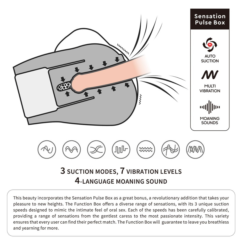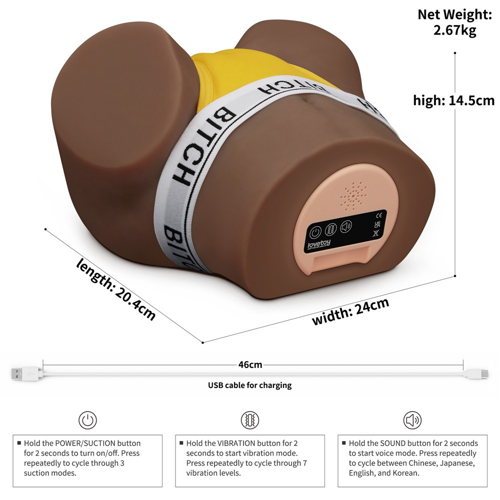 Made of high-quality leather-like material for men With recommended, realistically designed anus and vaginal openings Designed with 3 suction and 7 vibration functions, erotic during intercourse masturbator who makes sounds. Using self-control during intercourse It can be greatly improved, so its time can be significantly increased. The package It also includes a women's thong. English, Japanese, Korean, and Chinese languages for the audio . Product weight 2.67 kg.