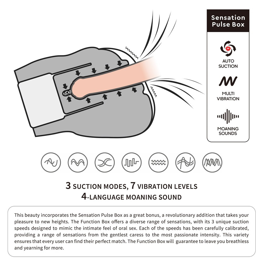 Made of high-quality leather-like material for men With recommended, realistically designed anus and vaginal openings Designed with 3 suction and 7 vibration functions, erotic during intercourse masturbator who makes sounds. Using self-control during intercourse It can be greatly improved, so its time can be significantly increased. The package It also includes a women's thong. English, Japanese, Korean, and Chinese languages for the audio . Product weight 2.67 kg.