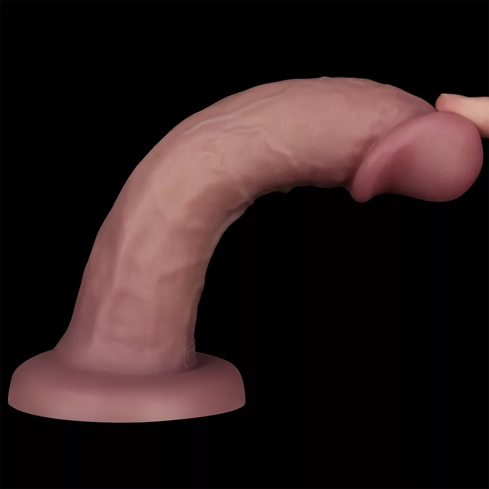 Soft outer layer and hard inner core, made of a leather-like material similar to body tissue, with 10 vibrational bendable with veined surface. Suction cup can be fixed on a flat surface.