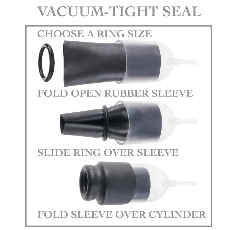 Először válassz egy gyűrűt, csúsztasd át az ujjon, hajtsd be az ujjat a felfújó hengerre, és élvezd a szoros zárást a makknál. Minden alkalommal, amikor megnyomod a felfújó labdát, az ujj gumi megragadja a péniszedet, és fel-le csúszik rajta.