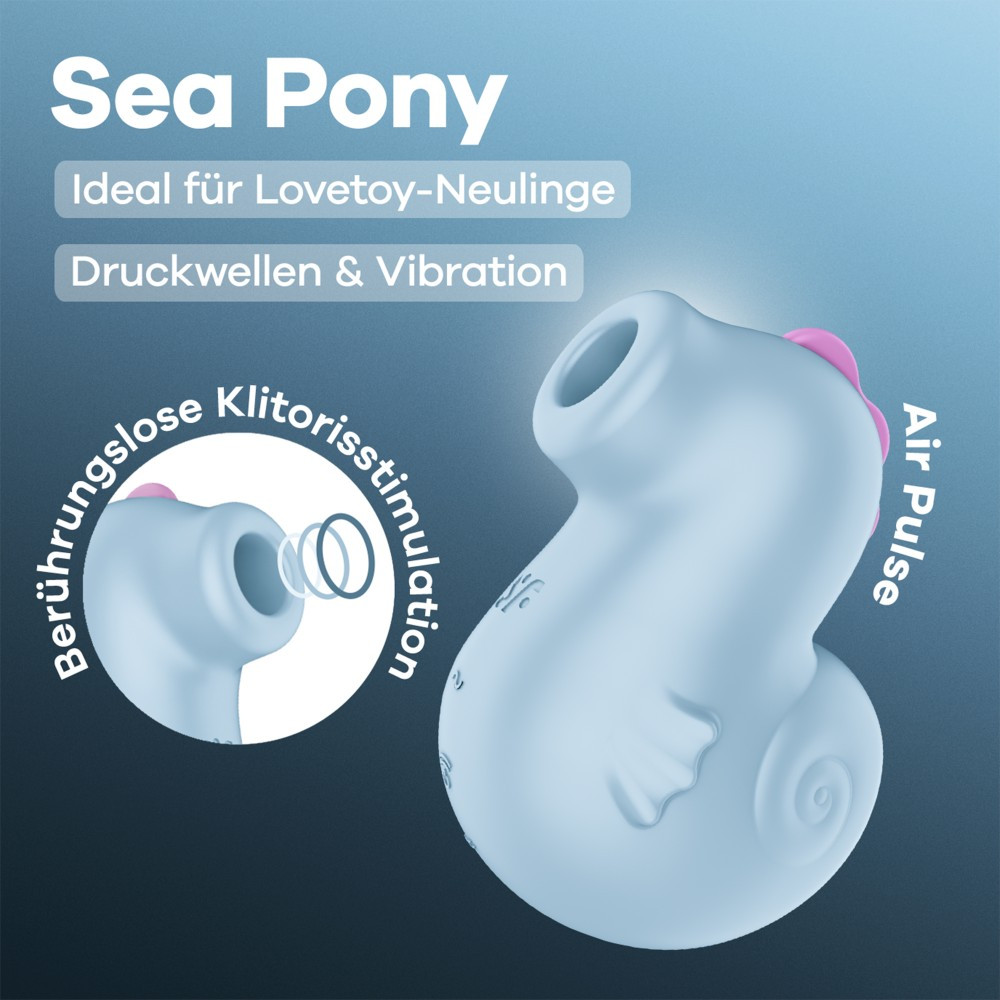 The Satisfyer Sea Pony nimmt Sie und Ihre Sinne mit auf eine Reise in eine Welt voller Vergnügen. Mit zwei unabhängig steuerbaren Motoren, 11 Pulsintensitäten und 13 Vibrationsprogrammen ermöglicht Ihnen dieser Pulsvibrator, Lust nach Ihren persönlichen Vorlieben zu genießen – von sanften Pulsationen bis hin zu kraftvollen Schwingungen. Aus körperfreundlichem Silikon gefertigt, passt sich der weiche Körper perfekt an deine Kurven an und umschließt sanft deine Klitoris ohne direkten Kontakt – für tief intensive Empfindungen und Highlights, die dich noch besser fühlen lassen als beim Tauchen in die schönsten Korallenriffe.
