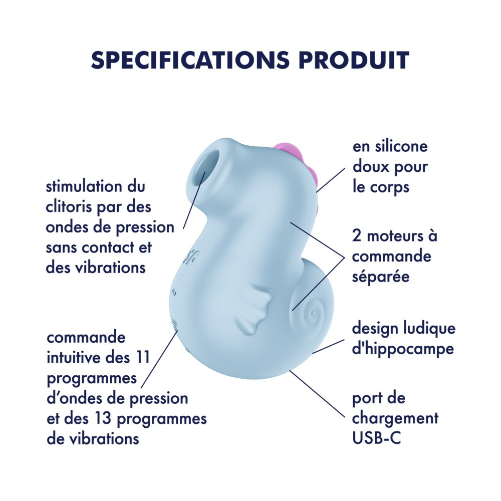 The Satisfyer Sea Pony takes you and your senses on a journey into a world of pleasure. With two independently controllable motors, 11 pulse intensities and 13 vibration programs, this pulse vibrator allows you to enjoy pleasure according to your personal preferences – from gentle pulsations to powerful vibrations. Made of body-friendly silicone, the soft body adapts perfectly to your curves and gently surrounds your clitoris without direct contact – for deeply intense sensations and highlights that make you feel even better than diving into the most beautiful coral reefs.